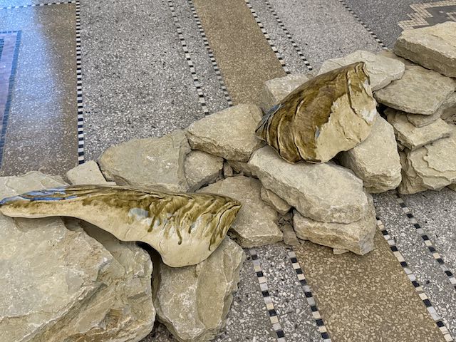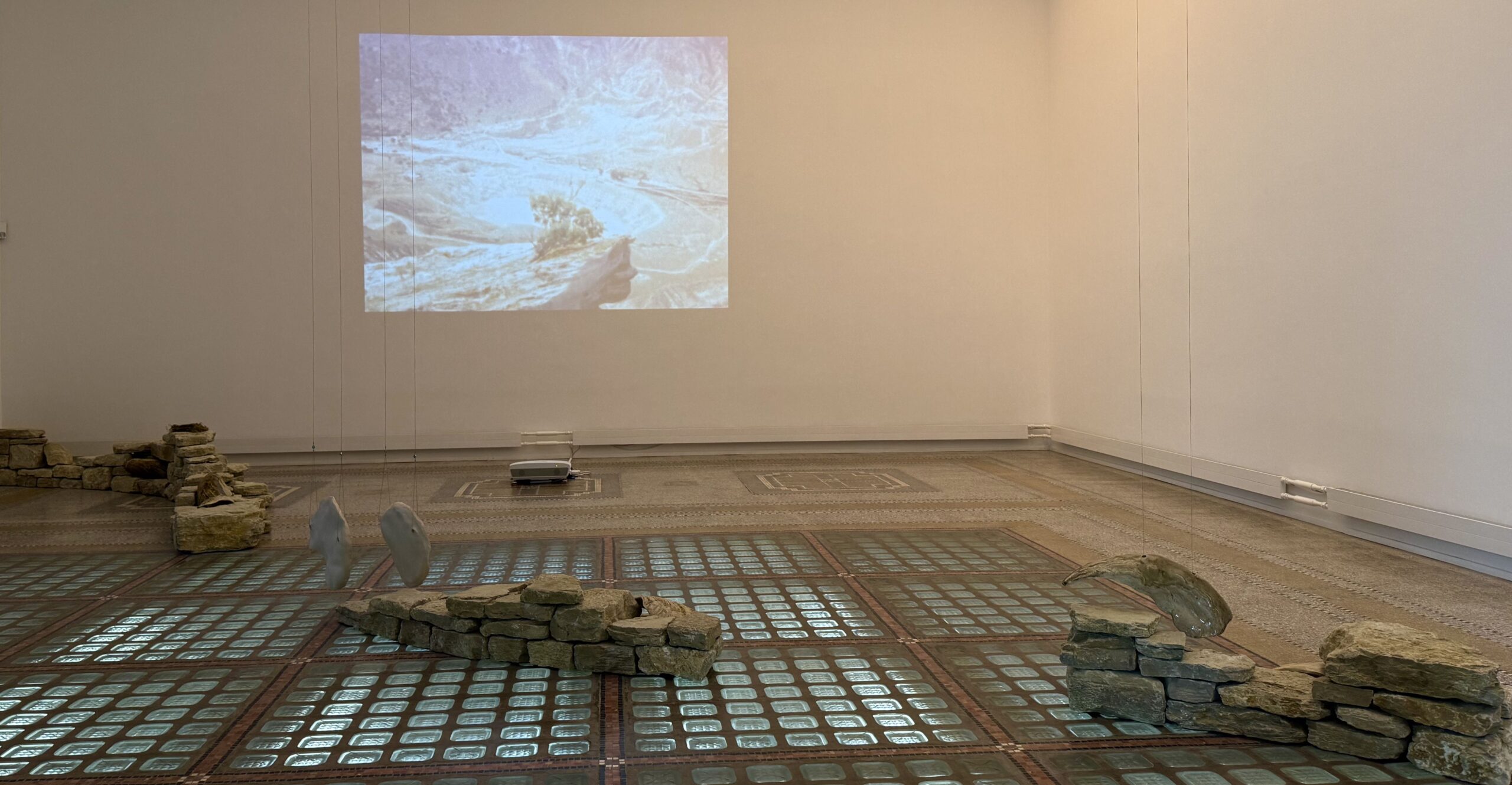 Konkret sieht das so aus: Ein Video, das die Künstlerin 2024 während ihrer Reise durch Lateinamerika drehte, bestimmt die Rückwand des Raumes, während auf dem Boden reale Steinmäucherchen eine mäandernde Linie bilden. In Bezug dazu stehen – fast unsichtbar – an Flügel erinnernde, emaillierte Keramikobjekte sowie wesenhaft wirkende Kalksteine.