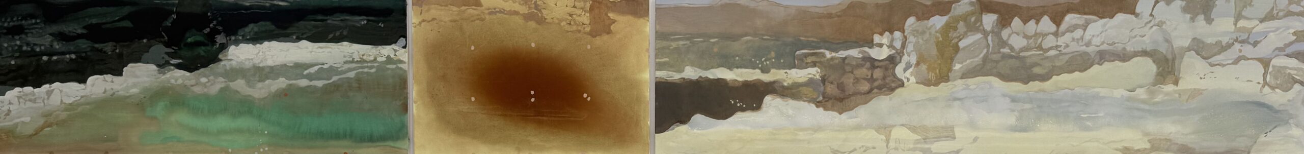 In einem zweiten angrenzenden Raum platzierte die Künstlerin u.a. einen zur Installation in Bezug stehenden, malerischen Fries, der sich wiedererkennbar als Malerei Charamandas zeigt, wie sie z.B. in der Einzelausstellung im Kunstmuseum Solothurn 2023 zu sehen war (übrigens auch dort in Kombination mit einer haptischen Sand-Stein-Objekt Situation).