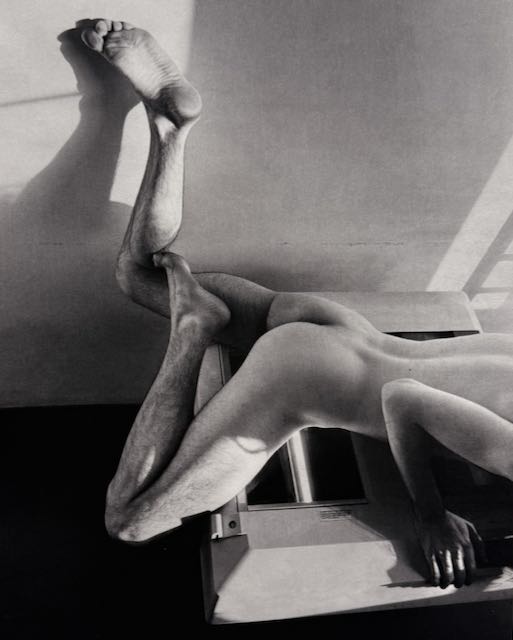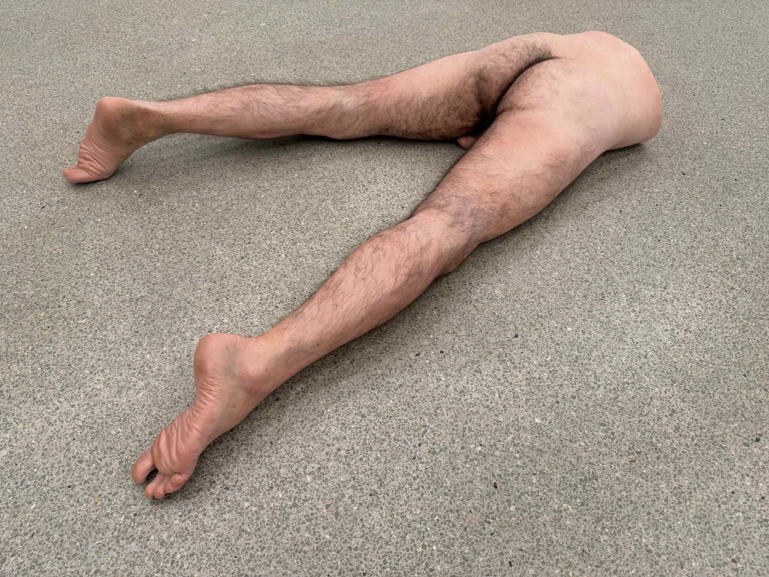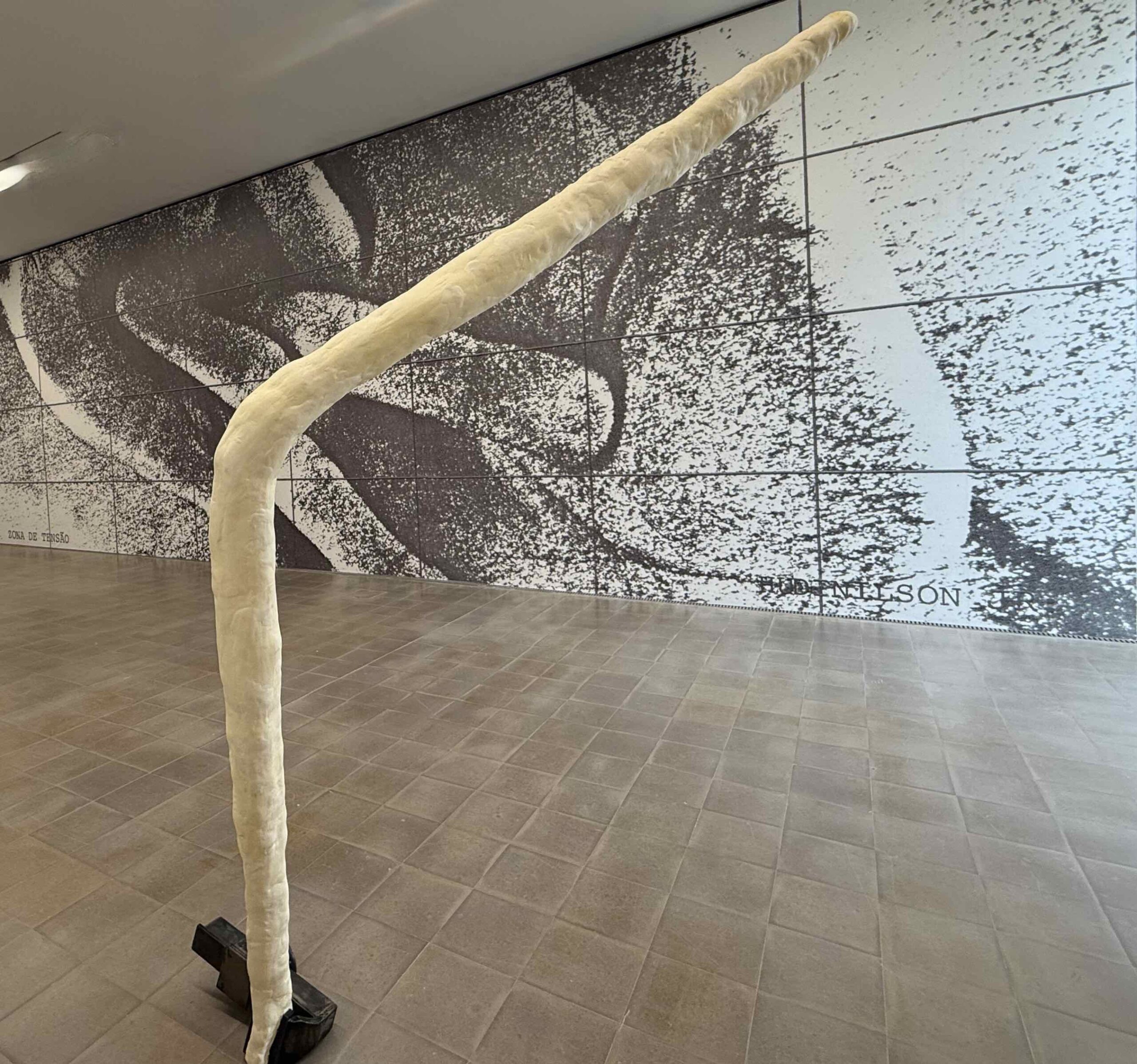 Zunächst: Die Thematik beider technisch gänzlich verschieden gestalteter Werke ist die männliche Sexualität, ein Thema, das spätestens seit #me to fast gänzlich von der Bildfläche verschwunden ist und hier auch nicht eindimensional «queer» erscheint. Ein Plus für die Einladung. Im Kontext des Kunsthaus Biel/Bienne ist es zum Teil eine Antwort auf die vorausgegangene Ausstellung von Alexandra Bircken, die eine ungewöhnliche Frauenposition markierte. Die Werke von HUDINILSON JR sind primär Fotokopien – nicht Fotokopien von Werken notabene, sondern Copy-Art, wie sie in dem langsam aus der Zeit der Militärdiktatur aufwachenden Brasilien praktisch ohne finanzielle Ressourcen möglich war.  Wer genau hinschaut bemerkt, wie der Künstler raffiniert mit Vergrösserungen (Verschleierungen!) arbeitet, wie Schamhaare sich unter dem Stichwort «Zona de Tensão» mit jeder Kopie mehr in flimmernd repetierte Assemblagen  verwandeln zum Beispiel. Wobei die Basisbilder hiezu aus einer Performance des Künstlers mit seinem Kopiergerät hervorgingen (Bild links). Monumental zeigt sich die Vorgehensweise wenn Fotokopien von verschränkten Fingern wandfüllend zu verschränkten Penis werden, im Dialog mit einem von einem metallenen Schraubstock aufrecht gehaltenen, winkelförmigen «Arm» aus Epoxidharz von Jean-Charles de Quillacq (Bild oben rechts).
