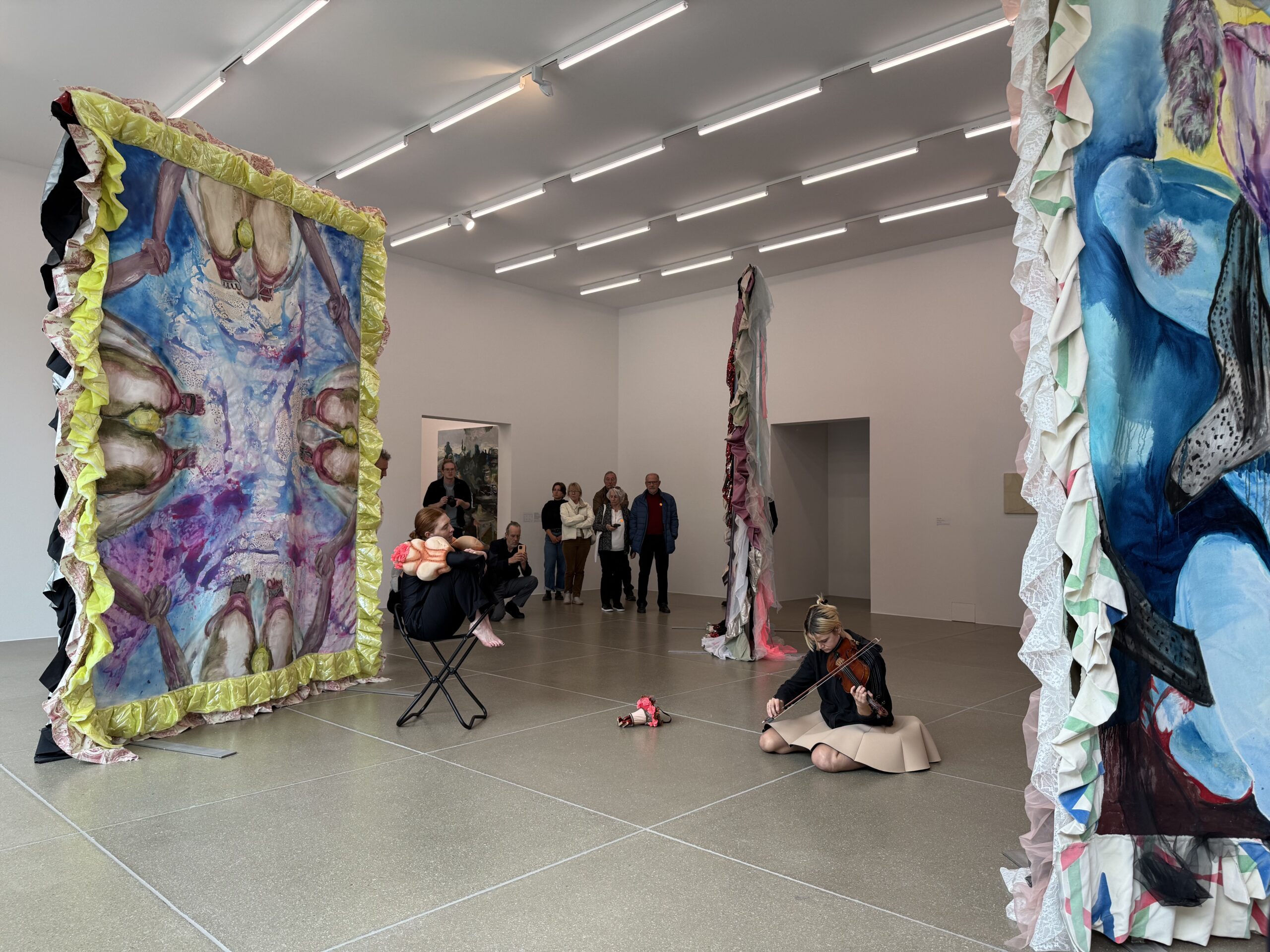 Mittendrin immer wieder die Künstlerin selbst, die – beglückt, so schien es mir – den Wegen der sich in Kostümen aus dem Textilfundus des Opernhauses Zürich («Rokokokokotten») bewegenden, musizierenden Performer*innen folgte .