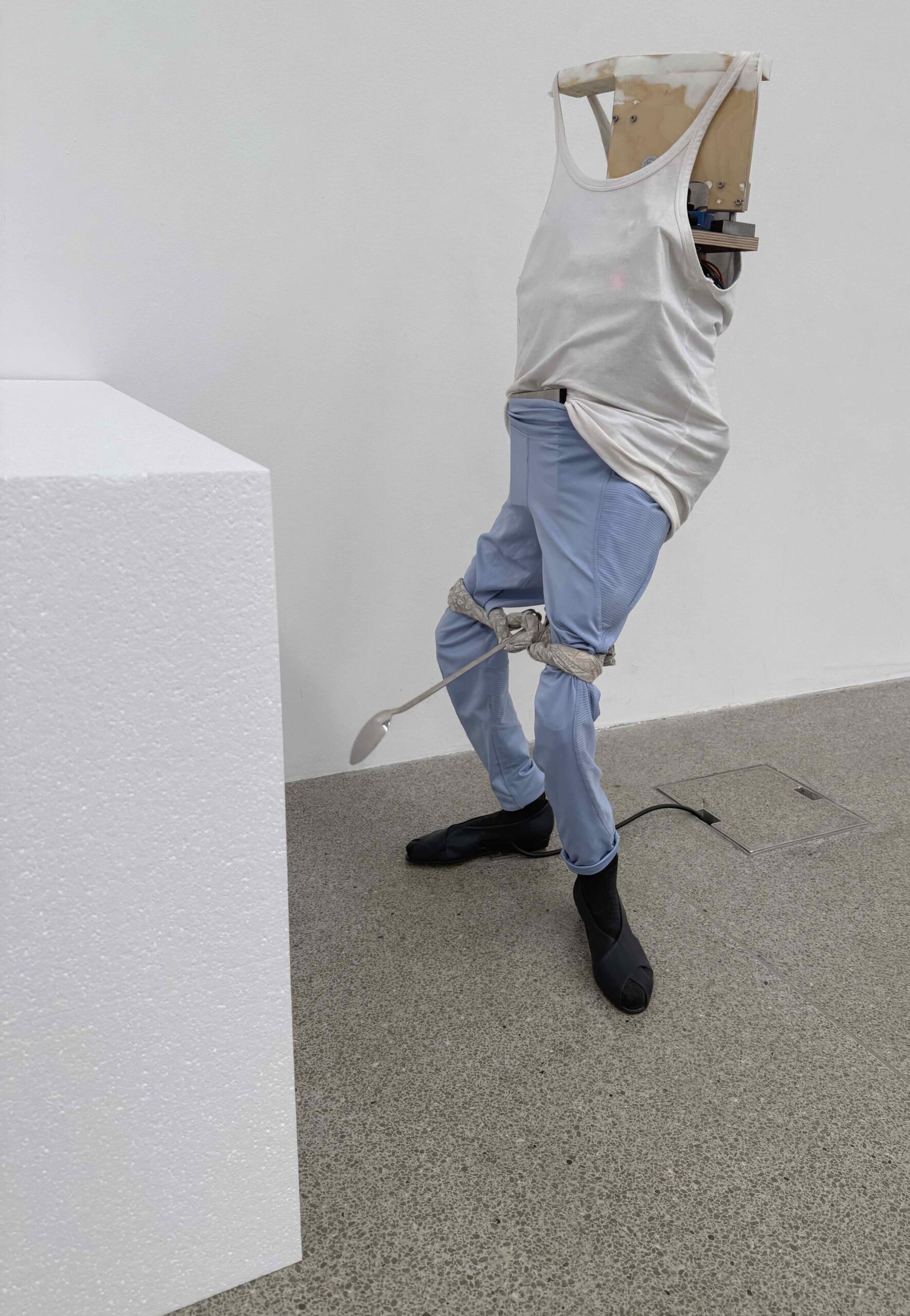 DE QUILLACQ arbeitet primär mit Körperformen, seien sie als Hohlräume in versteiften Jeans oder als Nachbildungen von Beinen – mal plastisch, mal giacomettihaft reduziert, mal «angezogen», mal nackt (mit Kunsthaar), mal lediglich die Genitalzone tragend. Inhaltlich erkenne ich ein Leiden an der Männlichkeit und den gesellschaftlichen Vorgaben ständiger Bereitschaft zu Erregung. Sehr deutlich ist dies in dem ziemlich hässlichen Roboter dargestellt, der mit einem überdimensionierten Löffel ständig auf die Genitalzone geschlagen wird, damit diese erregt wird. Dann erschlafft das Spiel, um mit einem schlagenden Sound gleich wieder an seine «Aufgabe» erinnert zu werden (Bild)