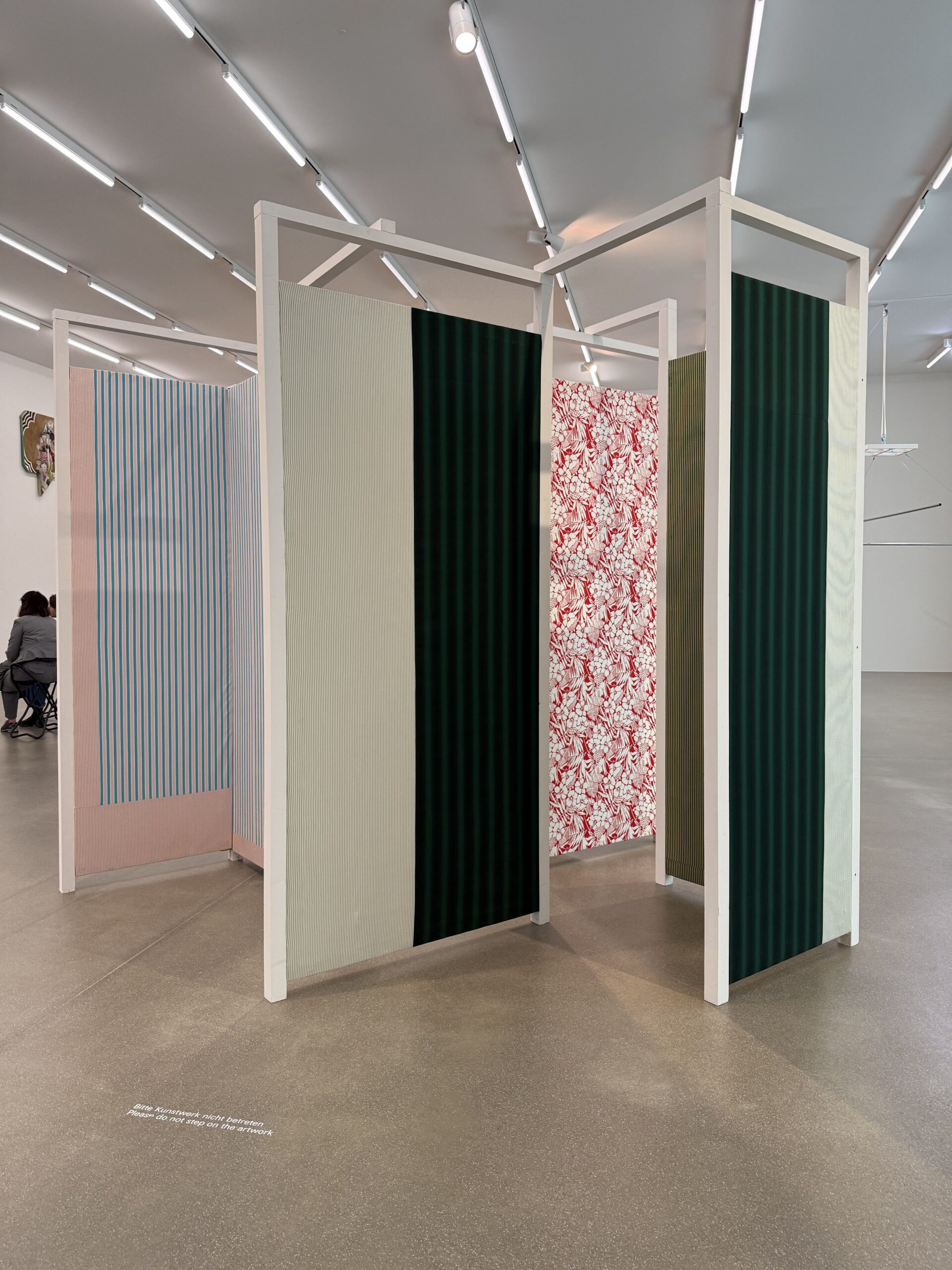 Plötzlich erkannte ich nun auch wie gewisse Elemente immer wiederkehrten, z.B. die Faszination «Stoffe», die Ende der 90er-Jahre als gespannte Bahnen Intérieurs bilden («Spiegel-Paravent», 1998 (Bild), «Eckstück», 2001), um dann 2002 zu «Krug und Tasse» zu werden und 2022/2023 in die lustvoll-sinnlich-weibliche Reihe «venusinfurs» zu münden – ein wahrer Cancan der Lüste; bei meinem Besuch durch die Klänge einer jungen Geigerin in ein Boudoir der Sehnsüchte und der Träume überführt. Ich gestehe: es kamen mir fast die Tränen (Bild)