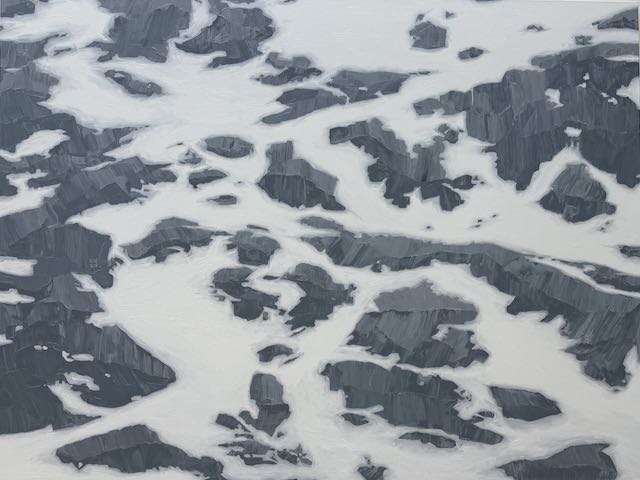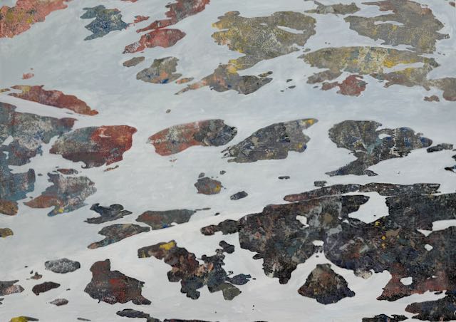 Ab hier kursiert das Cliché: «Lichtsteiner – ach der mit den verschneiten Berghängen». Diesem tritt die fast durchwegs mit relativ niedrig gehängten Grossformaten auf Leinwand (das heisst ohne Distanz generierendes Glas)  bestückte Ausstellung entgegen. Mit dem unmittelbaren Vis-à-Vis tritt der Farbauftrag, die Frage nach dem Untergrund und der Deckschicht in den Vordergrund, werden die einzelnen «Steine» zu kantigen Artefakten per se, die in freier Anordnung zur Bildkomposition werden, ganz so wie es der Titel der Ausstellung sagt: «Es ist nicht, was es ist». Und doch flimmert es dazwischen, der Berg ist da, scheinbar weit weg, aber es ist kein Berg, sondern Malerei, direkt vor meinen Augen.