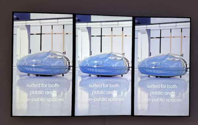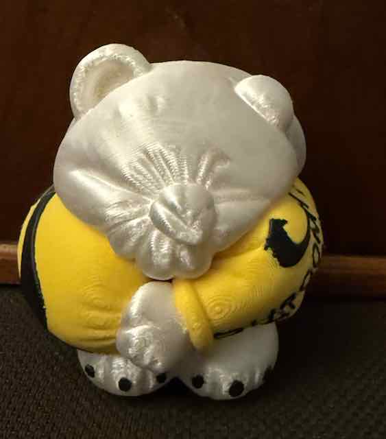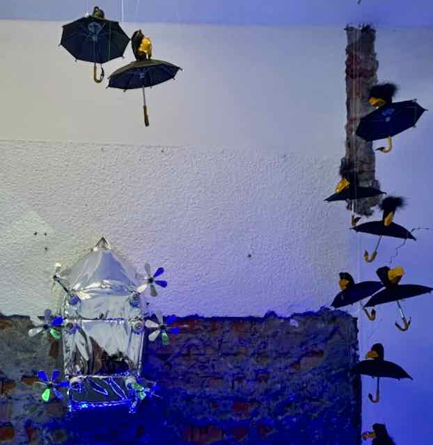 Schildkröten zum Beispiel einen Zusatzpanzer mit Ventilatoren (Bild rechts), für die Eisbären «Hopper Paw Sneakers» mit denen sie auf dem Wasser (statt Eis) gehen und jagen können etc. Und damit man immer wieder an die Situation denkt, erhielt man an der Vernissage aus einem Dispenser mit Münzeinwurf eine Kugel mit einem der Tiere aus dem 3D-Drucker zum mit nach Hause nehmen. Siehe Bild links. Kurator der Ausstellung war der Südkoreaner Park Byoung Uk, Kopf der «Nine Dragon Heads», einer internationalen Künstler*innengruppe, zu welcher auch mehrere Bieler Kunstschaffende zählen. Physisch gesehen haben die (zeitlich kurze) Ausstellung nur wenige, aber Vania Oh bespielt die Sozialen Medien First Class – und so reist die Ausstellung virtuell um die Welt und tut es weit über die Präsenz am Juraplatz hinaus. So konstruiert sie Bedeutung!