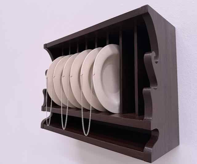 Auftakt bildet nämlich ein verdreifachtes (sprich: intensiviertes), Hochglanz-Video, das für Kapseln zum Weinen im öffentlichen Raum wirbt. Die Verwandtschaft mit den Sterbe-Kapseln ploppt sogleich vor dem inneren Auge auf. Siehe Bild! Doch schon die nächste Arbeit weist den Weg in eine andere Richtung. Eine aus glänzendem Chromstahl gefertigte Sitzgelegenheit mit Kissen, die – setzt man sich darauf – schnurrende (somit auf Wohlsein verweisende) Geräusche verlauten lässt. Das Tränenthema taucht dann im Folgenden in einem sowohl an Alice im Wunderland wie an antike Wasserbecken erinnerndes Aluminiumguss-Objekt, das den Lauf vergossener Tränen in etwas Emotionales, auch Kostbares verwandelt. Das berührt. Das Thema «wider die Entfremdung» ist aber auch in den durch feine Kettchen verbundenen Löffel-Duos sowie in den ähnlich verbundenen Suppentellern in einem sorgfältigst aus Holz gefertigten Gestell enthalten. Siehe Bild. Anita Muçolli, die in Basel studierte und auch da wohnhaft ist, bringt immer auch Persönliches in ihre Arbeit ein, hier in einer Zeichnung mit kleinen Mäusen, die vermutlich in Zusammenarbeit mit ihrer Tochter entstand.
