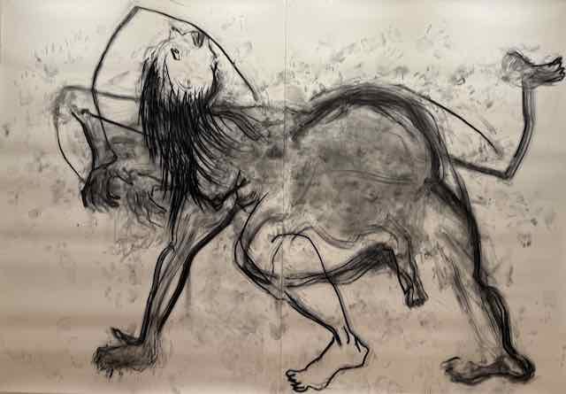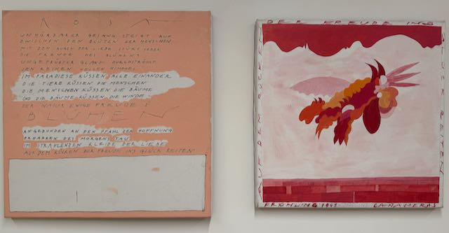 Am meisten beeindruckt hat mich aber die Kombination poetischer Texte mit dazugehörenden Bildern, wie z.B. die «Figuration des Frühlings» von 1991 (!): «BLÜHEN/ange-bunden an den Pfahl der Hoffnung/erharren des Morgens Tau/ im strahlenden Kleide der Liebe auf dem Rücken der Freude ins Glück reiten» und dazu ein Flügel-Krabben-Tier-Vogel, der witzig-heiter-hoffnungsvoll von links nach rechts die luftige Sphäre erkundet.