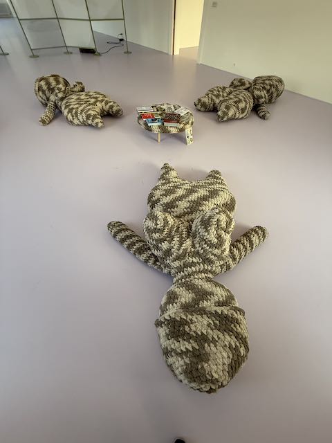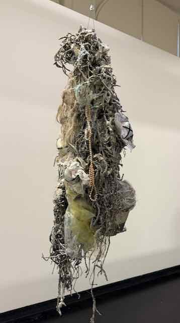 Die Objekt- und Performance-Künstlerin Ernestyma Orlowska (*1987 Stettin/PL – lebt in Bern) zeigt in der Salle Poma des Kunsthaus Biel mehrere, bedrohlich wirkende „Body Mutants“ aus verschiedenen Materialien. – Die zu meinem Erstaunen meist gezeigte Künstlerin der Cantonales Bern-Jura 2025 ist Marietta Schenk (*1985 in Huttwil), die in Biel den Prix Kunstverein erhielt, in Thun (Bild) mit einer Reihe von Hängeobjekten („Who is afraid of getting old“) und in Langenthal mit mehreren Glas-Abfallkübeln vertreten ist. Kraftvoll und überzeugend erlebte ich die „Bestia“ von Caroline Singeisen (*1977 Burgdorf – lebt in Bern) in Moutier.