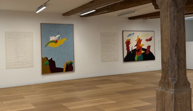 Meiner Überzeugung folgend, dass abseits der grossen Museen Spannendes und vor allem auch kreativ Inszeniertes stattfindet, gilt das letzte Kapitel dieses Newsletters Franz Grossert (1936 – 2009) im Sankturbanhof in Sursee (bis 1. März). Franz Grossert (Bruder des bekannten Bildhauers Michael Grossert ), der sich der Mutterlinie folgend Y Cañameras nannte, war eine schillernde Persönlichkeit. Ursprünglich war er Architekt, dann Kunstgeschichte-Student bis er in den 1960er-Jahren beschloss Künstler zu werden, «Maler, Keramiker, Zeichner, Schreiber, Finder und Nachdenker» wie er in einem Schriftbild festhält. Lebensmittelpunkt war Zürich, wo damals neue Lebensvisionen entstanden, die Fantasie (Utopie) zwischen Surrealismus und Pop Art die Kunst stilistisch beflügelte. Man denke an Friedrich Kuhn, Alex Sadkowsky u.a.m. In diesem Umfeld fand Grossert die künstlerische Sprache, die er lebenslang beibehielt. «Auf der Suche nach Freude sind meine Bilder farbig strahlend, fruchtig», schreibt er.