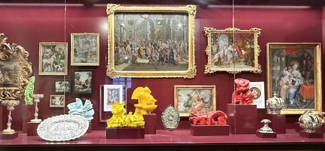 Nun – 16 Jahre später und da die Erinnerung an die Person teilweise verblasst ist – erhält Michael Sutter – bis vor kurzem Leiter der Kunsthalle Luzern – den Auftrag den Nachlass von Franz Grossert Y Cañameras neu zu sichten, das Künstlerische herauszufiltern und im barocken St. Urbanhof-Museum zu zeigen. Er tut dies unkonventionell und ideenreich. Die Ausstellung ist wohl für die meisten Auswärtigen eine Überraschung. Ich jedenfalls hatte, obwohl ich Michael Grossert persönlich gut kannte, nie Kenntnis davon, dass sein Bruder ebenfalls bildnerisch tätig war und formal nicht einmal so weit weg von ihm – zackiger ja, aber der Pop Art-Einfluss ist hier wie dort sichtbar. Sutter zeigt Grossert nicht chronologisch – würde ja auch nicht zu Cañameras passen – sondern themenbezogen – auch mit Rückblenden bis in die 1960er-Jahre. Dabei lässt er die Werke mit den Räumen, den Korridoren und dem Museum interagieren. Da gibt es auch einen kurzen Film, in dem Grossert das Fliegen zu üben scheint. Dann aber – gänzlich konträr – die knallgelben und roten Keramik-Skulpturen in der u.a. den Hinterglasbildern von Anna Barbara Abesch (18. Jh.) gewidmeten Grossvitrine. Ein provokanter in dunkelroten Samt gebetteter Kontrast, der freilich über den Glauben an ein beseeltes Universum auch Verbindungen zeigt