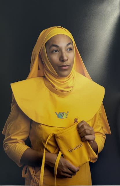 Im langgezogene Raum im oberen Stock hängen in der Diagonale leichte, fast durchscheinende, bodenlange Kleidungsstücke in Gelbtönen mit der Aufschrift «w.hole» und einem Kragen mit zwei kleinen aufgestickten Spritzkannen, die zusammen ein Herz bilden. Darunter die vom Kurator Daniel Morgenthaler im Auftrag der Künstlerin ausgewählten Schlarpen. Zusammen mit dem Porträt kouassis in eben diesem Outfit wird das eingangs erwähnte «Care»-Thema sichtbar: «Schaut zueinander». Was w.hole genau heisst, habe ich zwar nicht herausgefunden, auch nicht mit der auf der Anschrift zusätzlich genannten «milk», aber der leise Sound, eine 30minütige Tonaufnahme vom Familienbett, spricht Bände.