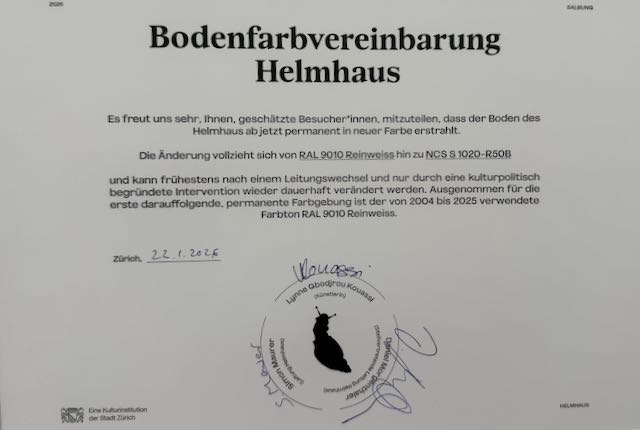 Kürzlich hatte ich in Zürich ein unerwartetes Zeitfenster und landete am Tag nach der Vernissage unvorbereitet in der Ausstellung von Lynne Gbodjrou Kouassi im Helmhaus und kam begeistert wieder heraus. So viel Präzision bis ins kleinste Detail habe ich selten erlebt. In einem weitgefassten Sinn würde ich die Ausstellung/Inszenierung in das aktuelle «Care»-Thema einordnen – im Sinne von dem Menschen dienend, ihn sanft begleitend. Beworben wird die Ausstellung mit der Neueinfärbung des von vielen «gehassten» blendend-weissen Bodens von RAL 9010 zu NCS S 1020-R50B (Lila). Dies wird nicht einfach nur im Saaltext kommuniziert, sondern fein säuberlich und mitsamt Konditionen in einem Vertrag (mit einer Schnecke als Logo) festgehalten.