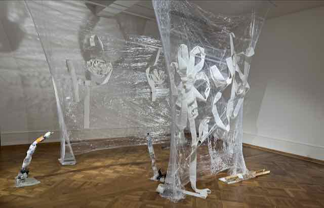 Es ist Zufall – aber was für einer! – dass gleichzeitig mit Anita Muçolli auch die Ausstellung von NELSON SCHAUB (*1995) mit dem Sonderpreis der Kiefer-Hablitzel- resp. Göhner-Stiftung gezeigt wird. Seine Präsentation ist für mich ein «no go» – ein widerliches Gebastel mit einem Karton-Sarg voller WC-Papier, mit von Multipack-Rasiermessern gestützten Badezimmer-Collagen/Objekten, mit unsorgfältig eingeschweissten WC-Papier-Bahnen, die ev eine Figur, eine Blume darstellen. Siehe Bild. Er/Sie sehe seine/ihre Kunst mit einem Niederreissen aller Geschlechtsidentitäten, heisst es. Für mich gilt, was eine Bieler Künstlerin, mit der ich diskutierte, richtig bemerkte, mit dem Dégout, den er auslöst, verschafft er sich die gewünschte thematische Aufmerksamkeit. Quod erat demonstrandum.