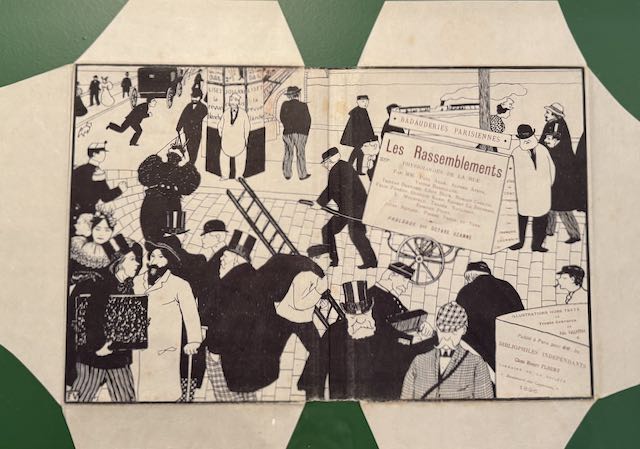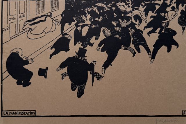 Als die grösste Retrospektive aller Zeiten, wurde sie angekündigt und beworben. Richtig, aber die Essenz liegt nicht beim malerischen Spätwerk, sondern bei der enormen Zahl von Druckgrafiken (meist Holzschnitte), die er im Paris der letzten 19Jh.-Jahre für verschiedenste Zeitungen/Zeitschriften/Magazine mit grösstmöglicher Eigenständigkeit bezüglich der vorgegebenen Themen veröffentlichen konnte. Er war so bebliebt und gefragt, dass man den Eindruck hat, nichts sei in diesem Paris der Jahrhundertwende mehr möglich gewesen ohne seinen kritisch-humorvollen Blick. Ein Highlight sind z.B. die Illustrationen, die er 1896 für das bibliophile Projekt «Les Rassemblements» schuf. Menschenan-sammlungen in Paris’s Strassen sollte er visualisieren. Mit welch scharfen Beobachtungen er hier die « Physiologies de la rue» in Paris einfängt, hier und anderswo auch sozialkritische – letztlich anarchistischen – Momente einschleust, ist grossartig. Seine Ironie ist fein, aber nichstdestotrotz prägnant.
