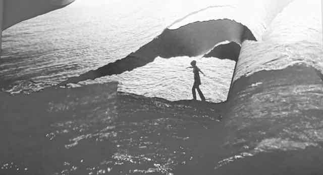 Dann aber wechseln in Aarau die Videos (meist Video-Projektionen, oft in grosszügiger Inszenierung nur eine pro Raum) bereits mehr oder weniger in die Gegenwart, allerdings stets unter dem Blickwinkel der technischen Entwicklungen. Trotzdem sind viele Projektionen eigentliche Ikonen! Zum Beispiel das «Angels Camp» von Emanuelle Antille – eine Vier-Kanal-Installation, die 2003 im Schweizer Pavillon der Biennale Venedig zu sehen war und ein drei Generationen Familien-Ferienlager mit viel Spass und Musik zeigt. Siehe Titelbild. Es gibt sehr viele Highlights – eines mag ich besonders, «Mare mosso» von Judith Albert. Es zeigt eine Meereslandschaft mit einer am Strand entlang balancierenden Figur. Das am Ufer aufschäumende Wasser ist indes keine Naturaufnahme, sondern ein immer neu gerissener Papierstreifen und die Figur eine Art Doppelbelichtung des Videos. Da wird mit dem Medium gearbeitet – das gefällt mir! Siehe Bild.