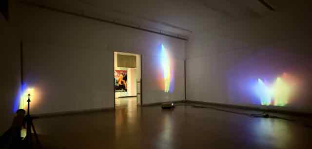 Doch der Reihe nach: Während man (vereinfacht formuliert) Bilder bis zurück ins Spätmittelalter immer noch an die Wand hängen kann, ist die in ihrer Pionierzeit bis in die 1960er/70er-Jahre zurückreichende Videokunst teilweise bereits so veraltet, dass sie nicht mehr gezeigt werden kann, da es die Abspielgeräte nicht mehr gibt, die Bänder verklebt sind usw. Luzern machte bereits 2019 eine Ausstellung zum Thema. In Aarau und Solothurn macht je eine Arbeit von Nam June Paik (Südkorea/Japan) den Auftakt zu den ansonsten rein schweizerischen Ausstellungen (eine Seltenheit!). Paik gilt unbestritten als «Vater» der Videokunst. Dass beide Arbeiten gezeigt werden können ist ein Glücksfall . «Fire place» (1992) kam im Keller eines privaten Unternehmens zum Vorschein – da gelandet, da defekt – und musste komplett neu aufgebaut werden. Dass die Arbeit wie eine Glut nach einem zerstörerischen Ereignis wirkt, ist geradezu symbolisch. Der Solothurner Auftakt ist eine brennende Kerze, deren züngelnde Flamme von einer Kamera aufgenommen wird und über Dreiröhren-Abspielgeräte (grün/blau/rot) dreifach an die Wand projiziert wird. «Wenn die letzten dieser Abspielgeräte ausgestiegen sind, ist «One candle» nicht mehr inszenierbar» (Zitat Aufdi Aufdermauer). Siehe Bild.