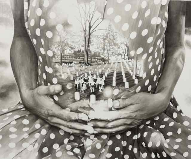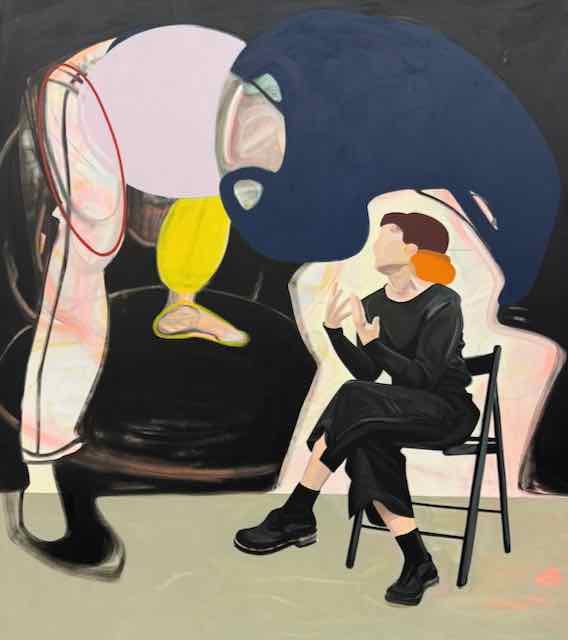 In Bann gezogen haben mich in Luzern u.a. die Acryl-Tusche-Zeichnungen von Irene Bisang (*1981 Luzern). Die Assoziation Julia Steiner täuscht, die Neo Rauch-Schülerin schafft eher unheimliche, metaphorische Szenerien; in „Womb“ (Gebärmutter) sehen wir im Zentrum ein Gräberfeld sowie tanzende Kinder. Ki ist ein allgegenwärtiges Thema; originell fand ich die ausgesprochen bildliche Interpretation im Ölbild „KI frisst die Menschheit“ von Miranda Fierz (*1987/ Luzern). Ein Kunst-Quiz präsentiert Guy Markowitsch (Guy nicht Rémy!), Dozent für Theorie an der Hochschule Luzern, auf einem Regal stehen klassiche Kunstgeschichte-Hefte mit veränderten Namen wie „Me rêver“ – unschwer zu erraten bei diesen Ohrringen! – Aber andere sind ganz schön knifflig und entfachten die Lust der Ankaufskommissionen.