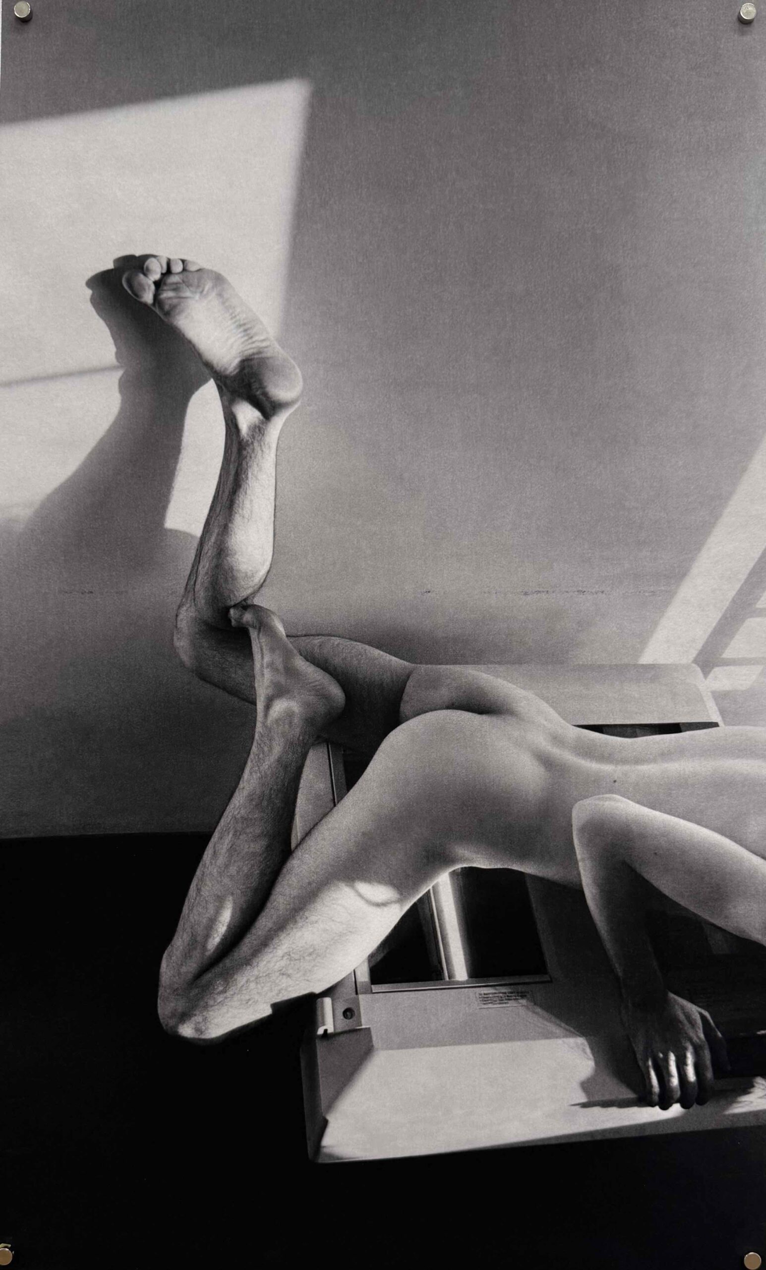 Die Werke von HUDINILSON JR sind primär Fotokopien – nicht Fotokopien von Werken notabene, sondern Copy-Art, wie sie in dem langsam aus der Zeit der Militärdiktatur aufwachenden Brasilien praktisch ohne finanzielle Ressourcen möglich war. Wer genau hinschaut bemerkt, wie der Künstler raffiniert mit Vergrösserungen (Verschleierungen!) arbeitet, wie Schamhaare sich unter dem Stichwort «Zona de Tensão» mit jeder Kopie mehr in flimmernd repetierte Assemblagen verwandeln zum Beispiel. Wobei die Basisbilder hiezu aus einer Performance des Künstlers mit seinem Kopiergerät hervorgingen(Siehe Bild) Monumental zeigt sich die Vorgehensweise wenn Fotokopien von verschränkten Fingern wandfüllend zu verschränkten Penis werden, im Dialog mit einem von einem metallenen Schraubstock aufrecht gehaltenen, winkelförmigen «Arm» aus Epoxidharz von Jean-Charles de Quillacq.