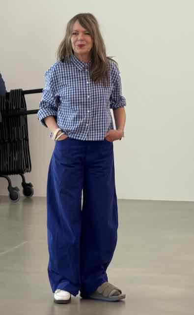 DE QUILLACQ arbeitet primär mit Körperformen, seien sie als Hohlräume in versteiften Jeans oder als Nachbildungen von Beinen – mal plastisch, mal giacomettihaft reduziert, mal «angezogen», mal nackt (mit Kunsthaar), mal lediglich die Genitalzone tragend. Inhaltlich erkenne ich ein Leiden an der Männlichkeit und den gesellschaftlichen Vorgaben ständiger Bereitschaft zu Erregung.