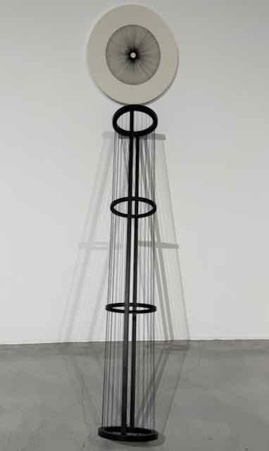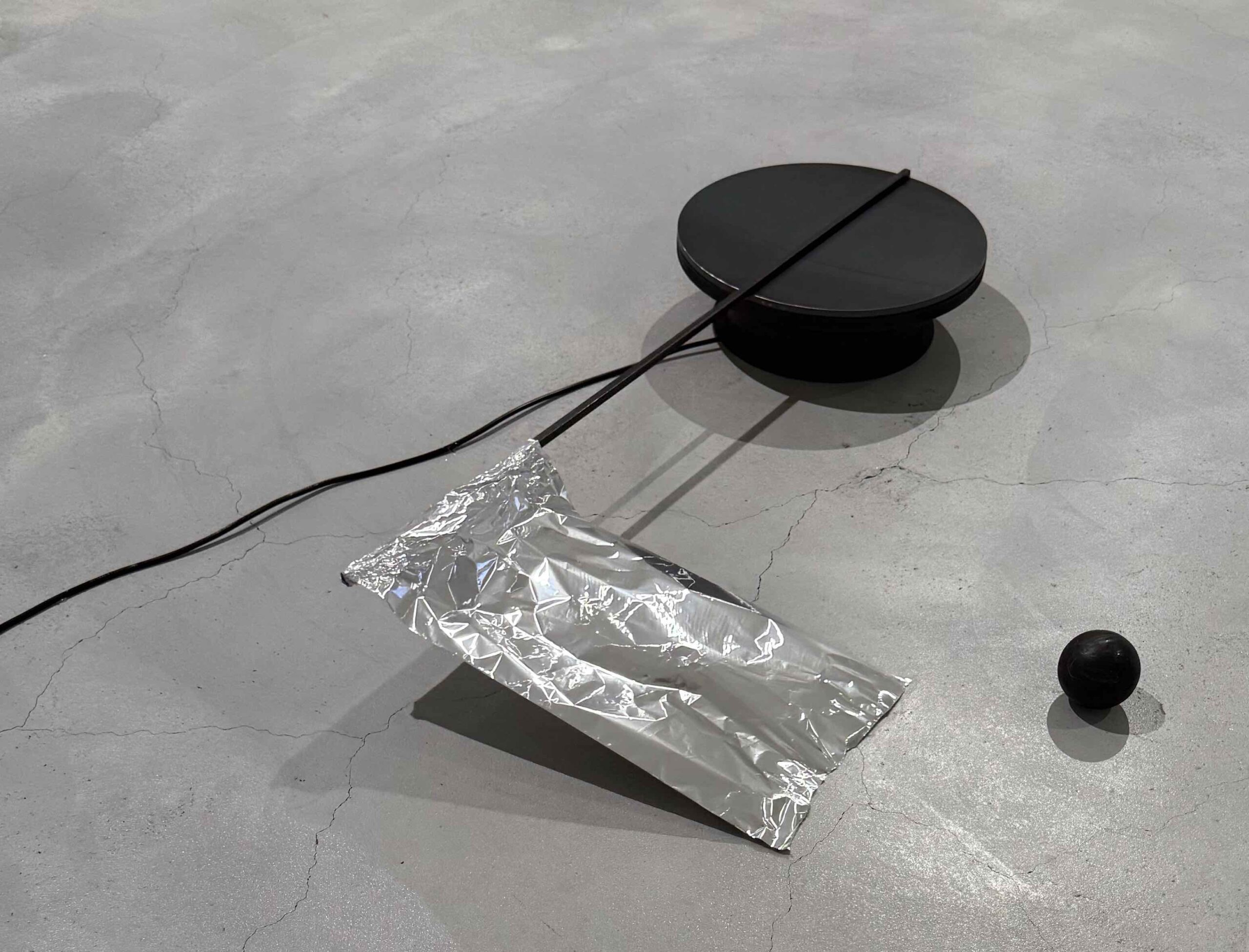 Auch ich wünschte mir dann und wann, der Künstler würde ein bisschen «verführerischer» arbeiten als nur eine relativ feste Aluminiumfolie in Plattenspieler- Kreisbewegungen über den Beton-Boden streichen zu lassen, lediglich von einer kleinen Kugel als Hindernis in Rhythmus versetzt (siehe Bild). Doch da sitzt ihm halt die «arte povera» im Nacken, die dem in der Schweiz ausgebildeten in den 1980er-Jahren die künstlerische (und mentale) Rückkoppelung zu seiner italienischen Herkunft ermöglichte. Eines der spannendsten Objekte im Kontext ist für mich die «Gitarre», die leicht ersichtliche Elemente einer Gitarre in einen Hohlkörper mit Saiten verwandelt (siehe Bild)