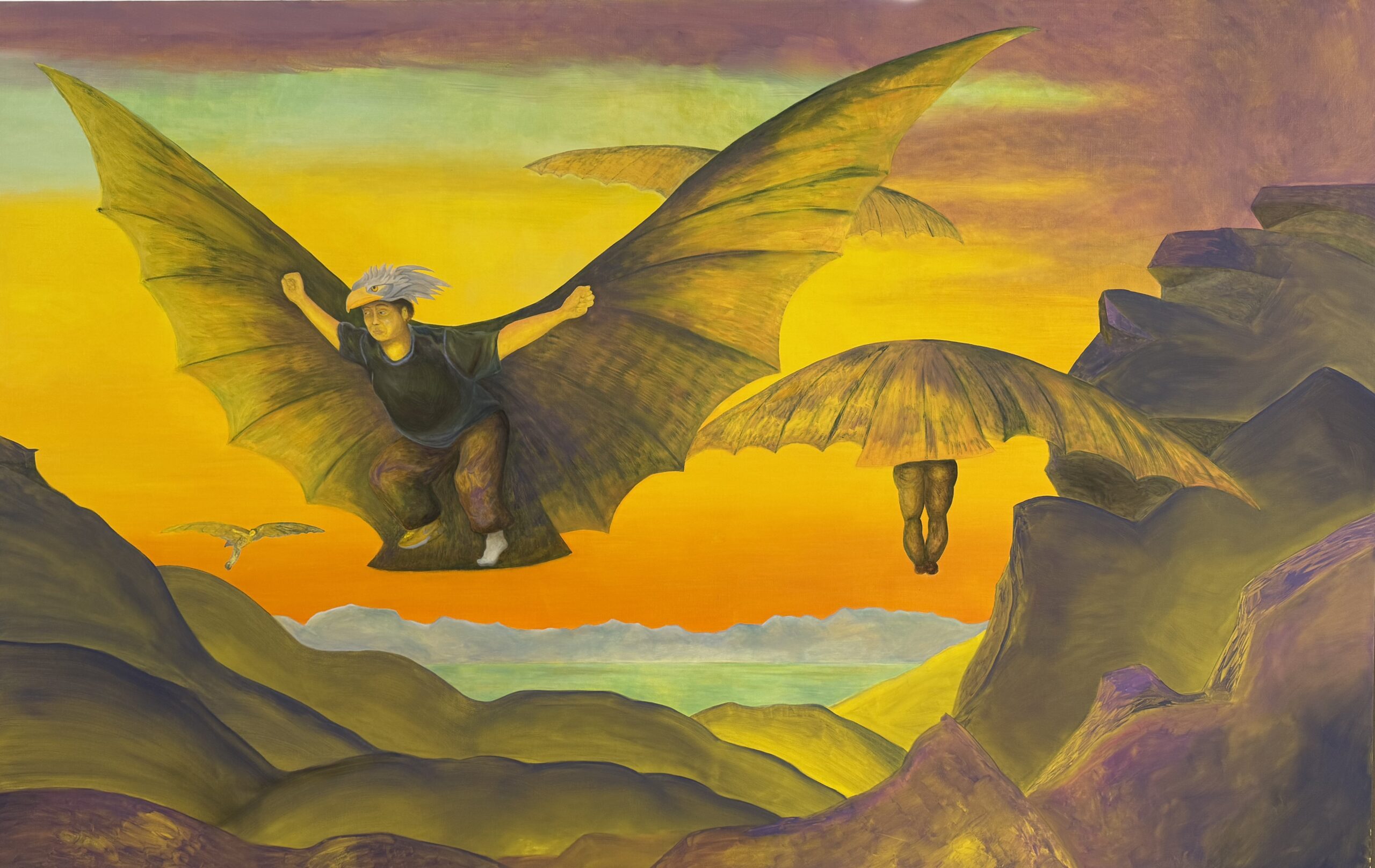 Ein Besuch der Ausstellung von Leiko Ikemura in Chur muss unbedingt einen Abstecher ins «Labor» integrieren, wo aktuell die Manor-Preisträgerin Graubünden, die Malerin Noémi Pfister (*1991 Locarno) , ihren ersten institutionellen Einzel-Auftritt hat. Auf die nach Ausbildungsjahren in Genf nun in Basel wohnhafte Bündnerin (Bürgerort Trun) bin ich erstmals im Kunsthaus Langenthal aufmerksam geworden, in einer Ausstellung, die sich mit dem Körper im digitalen Zeitalter befasste. Was mir gefallen hat und sich nun in Chur bestätigte, ist wie sie aktuelle Themen in fantastische – gar satirische – Szenerien einbettet und darin mit Figuren «spielt», die sie aus irgendeiner Website herausgeschnitten hat und nun für ihre «Erzählung» wiederverwendet. Zum Beispiel wenn sie Jugendliche die Stümpfe gefällter Bäume in einer bereits kahlen Landschaft als Hüpf-Sockel nutzen lässt oder wenn sie eine asiatisch wirkende, eher bullige Figur mit Adler-Perücke ikarusgleich aus einem feurig-gelben Himmel hinuntersegeln lässt. Die Figur stürzt freilich nicht, sie scheint vielmehr unhörbar anzukündigen: Wir kommen! (Siehe grosses Bild oben).