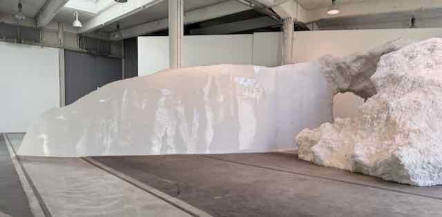Nach dem Besuch in Vaduz reicht die Zeit noch in St. Gallen die Lockremise anzusteuern, wo SARA MASÜGER, Zürcher Künstlerin mit Bündner Wurzeln (*1978), eine eindrückliche Installation aufgebaut hat. Wie schon in früheren Ausstellungen (Chur, Solothurn) dominiert ein weisses «Felsmassiv» die Szenerie, Sinnbild für die Materialität des Körpers nach aussen und seinem Reichtum im Innern. Es ist diesmal weniger auf «Höhle» als vielmehr auf Eingang, Passage und Ausgang ausgerichtet, spielt mit dem von den Fenstern einfallenden Licht respektive dessen Schatten, sodass eine stetig wechselnde, lebendige Situation entsteht. Wohin dieser Ausgang führt ist freilich nicht so klar, denn eigentlich könnte der offene Hinterraum auch ein immaterieller Vorstellungsraum sein, jedenfalls erinnern mich die von der Decke hängenden grossen, schwarzen Tropfen (lackierter Acrystal) an im Fluss angehaltene Lebenselixiere (dem im Saaltext erwähnten Verweis auf Musiknoten mag ich nicht so recht zu folgen, doch die Freiheit der Interpretation ist Teil des Erlebnis Kunst).