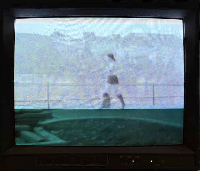 Doch der Reihe nach: Während man (vereinfacht formuliert) Bilder bis zurück ins Spätmittelalter immer noch an die Wand hängen kann, ist die in ihrer Pionierzeit bis in die 1960er/70er-Jahre zurückreichende Videokunst teilweise bereits so veraltet, dass sie nicht mehr gezeigt werden kann, da es die Abspielgeräte nicht mehr gibt, die Bänder verklebt sind usw. Luzern machte bereits 2019 eine Ausstellung zum Thema. In Aarau und Solothurn macht je eine Arbeit von Nam June Paik (Südkorea/Japan) den Auftakt zu den ansonsten rein schweizerischen Ausstellungen (eine Seltenheit!). Paik gilt unbestritten als «Vater» der Videokunst. Dass beide Arbeiten gezeigt werden können ist ein Glücksfall . «Fire place» (1992) kam im Keller eines privaten Unternehmens zum Vorschein – da gelandet, da defekt – und musste komplett neu aufgebaut werden. Dass die Arbeit wie eine Glut nach einem zerstörerischen Ereignis wirkt, ist geradezu symbolisch. Der Solothurner Auftakt ist eine brennende Kerze, deren züngelnde Flamme von einer Kamera aufgenommen wird und über Dreiröhren-Abspielgeräte (grün/blau/rot) dreifach an die Wand projiziert wird. «Wenn die letzten dieser Abspielgeräte ausgestiegen sind, ist «One candle» nicht mehr inszenierbar» (Zitat Aufdi Aufdermauer). Siehe Bild.